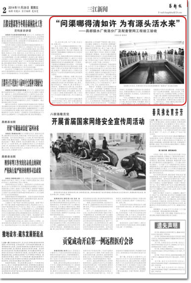 根據地委、行署的統(tǒng)一部署,項目總投資1.93億元,日供水量3萬立方米,于2013年7月4日正式開工建設,建設凈水廠1座,配套建設取水壩及120米管架橋1座,取水、輸水管道總廠39023米,配水管網總廠22140米。修建綜合辦公樓1座,水處理車間1座,以及變配電間、反沖洗泵房、加氯加藥間、絮凝平流池、V型過濾池、清水池、門衛(wèi)室大門圍墻、附屬設施等工程,于2014年7月20日完成所有建設內容,并正式通水運行。