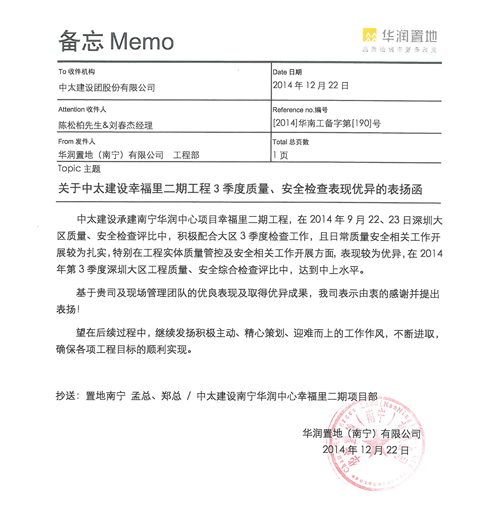 近日,華潤置地(南寧)有限公司發(fā)來表揚函,以表揚集團公司在幸福里二期工程三季度質(zhì)量、安全檢查中的優(yōu)異表現(xiàn)。