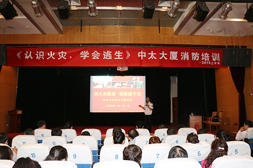5月15日上午,中太大廈2015年上半年消防培訓在二樓報告廳舉行,邀請石家莊市冀消安防火教育中心宣教處教員程俊磊老師,為大家?guī)砹艘粓鲆浴罢一馂?zāi)隱患保家庭安全”為主題的消防知識普及專題講座。