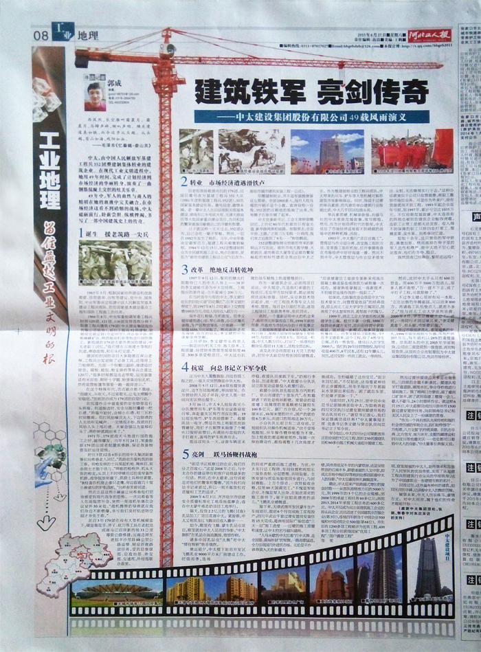 “人馬未歇的中太扛著‘打中太牌、走全國路、謀海外財’的軍旗,一路高歌猛進(jìn),全力征戰(zhàn)國內(nèi)外建筑市場。無論是平沙莽莽黃入天的新疆戈壁,風(fēng)吹草低見牛羊的內(nèi)蒙草原,還是吳儂軟語的江南水鄉(xiāng),群雄逐鹿的人文中原,抑或北非地中海沿岸等地到處都活躍著中太人的身影!敝刑偛脧埫鞫Y娓娓道來。