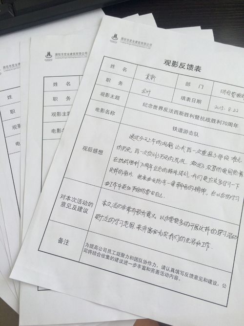 |   2015年8月22日,為紀(jì)念反法西斯戰(zhàn)爭(zhēng)勝利70周年,宏業(yè)公司組織全體員工進(jìn)行了一次革命傳統(tǒng)教育活動(dòng),觀看了電影《鐵道游擊隊(duì)》,一同回顧了那段血淚鑄成的抗戰(zhàn)史,共同緬懷先烈們的英靈。