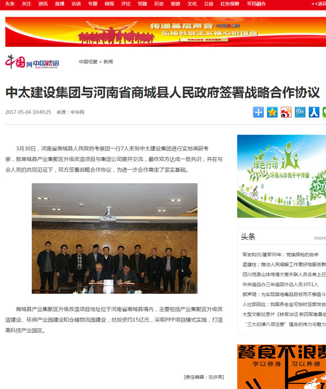 中國(guó)網(wǎng)報(bào)道了“中太建設(shè)集團(tuán)與河南省商城縣人民政府簽署戰(zhàn)略合作協(xié)議”