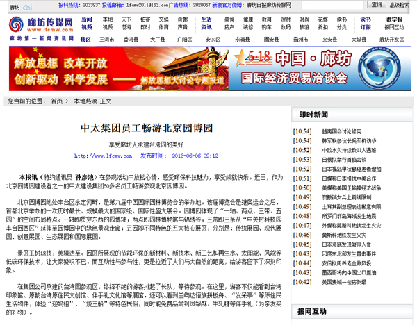 廊坊傳媒網(wǎng)報道了中太集團員工暢游北京園博園